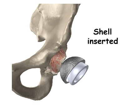 Bước 3: Đặt hõm khớp nhân tạo. Hõm khớp nhân tạo sẽ được đặt vào ổ khớp đã được chuẩn bị và cố định. Hõm khớp nhân tạo sẽ được cố định bằng xi măng sinh học (nếu khớp nhân tạo có xi măng) hoặc bằng các vít cố định( nếu bộ khớp nhân tạo không xi măng).