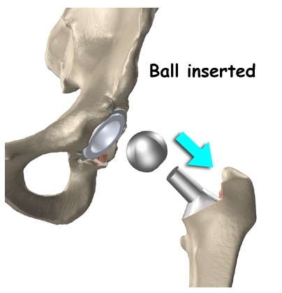 Bước 5: Đặt chuôi khớp nhân tạo. Chuôi khớp sẽ được đặt vào trong ống tuỷ và được cố định. Nếu là bộ khớp nhân tạo có xi măng, chuôi khớp sẽ được cố định bằng xi măng sinh học. Nếu là bộ khớp nhân tạo không có xi măng, chuôi khớp sẽ được cố định nhờ 2 yếu tố: 1) Sự nén chặt( Press fit); 2) Sự phát triển của xương mới bám chặt vào chuôi khớp nhân tạo nhờ cấu trúc của bề mặt chuôi và chuôi được phủ 1 lớp đặc biệt kích thích xương phát triển vào.