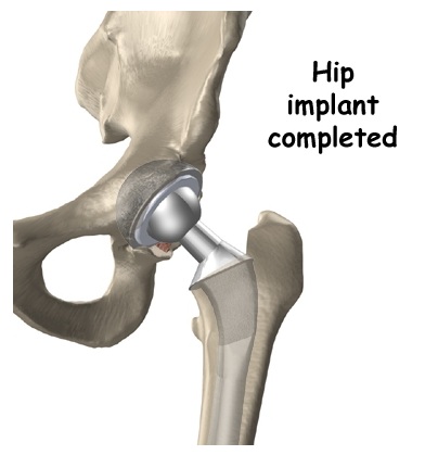 Bước 7: Hoàn tất. Đặt khớp háng nhân tạo, kiểm tra lần cuối cùng sự vững của khớp.