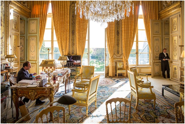 Tổng thống vừa mãn nhiệm François Hollande trong "Salon Doré" hay còn gọi là Phòng Vàng, văn phòng làm việc chính thức của các đời tổng thống Pháp. Theo truyền thống, khoảng cách giữa chiếc ghế xếp xung quanh "chiếc bàn Đệ nhất Pháp quốc" trong Phòng Vàng luôn đúng 60 cm.