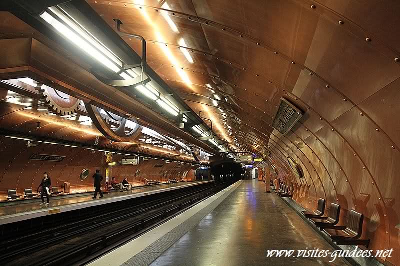 Bến Arts et Métiers, trên tuyến 11, lấy cảm hứng từ cách trang trí của Bảo tàng Nghệ thuật và Nghề nghiệp (Musée des Arts et Métiers) chuyên trưng bày các loại hình sáng tạo kỹ thuật và công nghệ. Đây là một trong những trạm khiến hành khách ngạc nhiên nhất, vì hoàn toàn được lát bằng ván đồng ghép chặt với nhau bằng đinh tán và được trang trí với những mô hình cửa tầu ngầm Nautilus lấy cảm hứng từ phim 20 vạn dặm dưới đáy biển của Jules Verne.