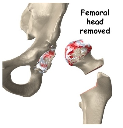 Bước 1: Cắt bỏ phần xương và sụn khớp của xương đùi bị tổn thương. Các bác sỹ sẽ cắt bỏ phần chỏm và cổ xương đùi đến gần nền cổ xương đùi.
