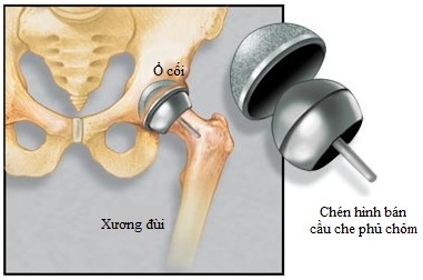 Bước 3: Đặt hõm khớp nhân tạo. Hõm khớp nhân tạo sẽ được đặt vào ổ khớp đã được chuẩn bị và cố định. Hõm khớp nhân tạo sẽ được cố định bằng xi măng sinh học (nếu khớp nhân tạo có xi măng) hoặc bằng các vít cố định( nếu bộ khớp nhân tạo không xi măng).
