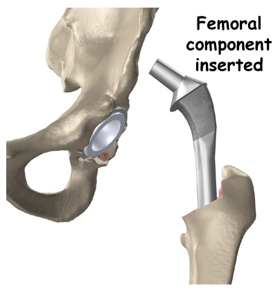 Bước 5: Đặt chuôi khớp nhân tạo. Chuôi khớp sẽ được đặt vào trong ống tuỷ và được cố định. Nếu là bộ khớp nhân tạo có xi măng, chuôi khớp sẽ được cố định bằng xi măng sinh học. Nếu là bộ khớp nhân tạo không có xi măng, chuôi khớp sẽ được cố định nhờ 2 yếu tố: 1) Sự nén chặt( Press fit); 2) Sự phát triển của xương mới bám chặt vào chuôi khớp nhân tạo nhờ cấu trúc của bề mặt chuôi và chuôi được phủ 1 lớp đặc biệt kích thích xương phát triển vào.