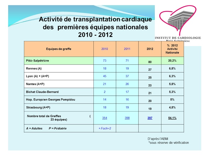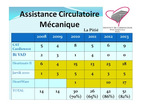 Đối với dụng cụ hỗ trợ thất trái, năm 2013, Trung tâm đã thực hiện 9 trường hợp tim nhân tạo toàn bộ (Coeur artificiel total – Cardiowest), 49 trường hợp hỗ trợ thất trái (18 Heartmate II, 5 Jarvik và 17 Heartware).